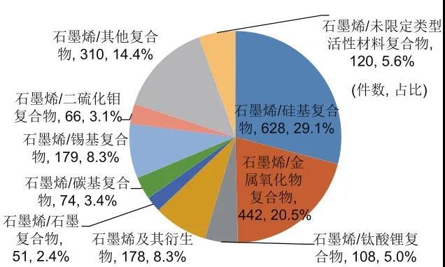 鋰離子電池負(fù)極中,石墨烯應(yīng)用方式通常有兩類,一類是將石墨烯直接作為活性材料;一類是將石墨烯與活性材料復(fù)合,以緩解活性材料在充放電過程中的體積變化,改善活性材料導(dǎo)電性。由圖10可知,直接使用石墨烯及其衍生物作為負(fù)極活性材料的專利實(shí)際上占比很少,僅為8.3%。石墨烯與硅基材料、金屬氧化物復(fù)合,尤其是與硅基材料復(fù)合是專利申請最為集中的領(lǐng)域。硅基負(fù)極材料因其具有較高理論比容量,被視為比較理想的下一代鋰離子電池負(fù)極材料,不少負(fù)極材料生產(chǎn)企業(yè)均已開始布局硅基負(fù)極的開發(fā)與商業(yè)化??梢?,石墨烯及其衍生物在鋰離子電池電極材料中大多數(shù)還是以與其他活性成分復(fù)合的方式存在,將石墨烯及其衍生物作為電極材料的專利申請量僅占少數(shù)。可見,如何讓石墨烯在儲(chǔ)能體系中發(fā)揮其最大效用仍然是研發(fā)人員需要解決的技術(shù)難題。需要說明的是,部分專利文獻(xiàn)中對與石墨烯復(fù)合的活性材料類型沒有特殊限定,在圖10和圖11中將此類專利歸類為“石墨烯/未限定類型活性材料復(fù)合物”,圖10中此類專利有120件,占比5.6%。