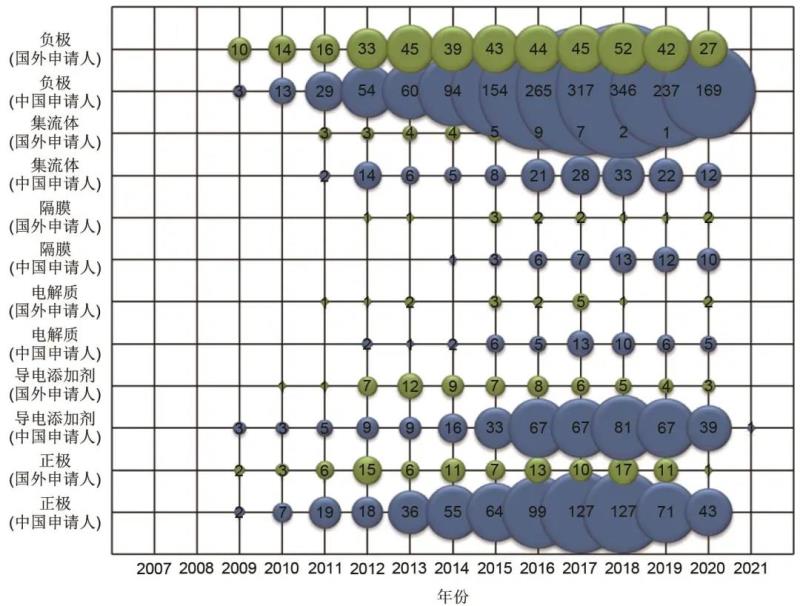 圖21 石墨烯在鋰硫電池各結(jié)構(gòu)部件中應(yīng)用的專利申請量