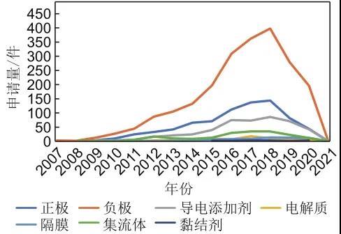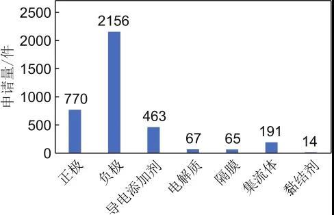 圖7 石墨烯在鋰離子電池各結(jié)構(gòu)部件中應(yīng)用的專利申請量