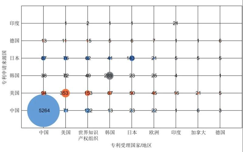 分析一件專利的申請來源國及對應(yīng)的專利受理國,可以知道專利技術(shù)的輸入輸出情況(機(jī)構(gòu))。如圖3所示,中國申請人(機(jī)構(gòu))在本國的申請量最大,在海外的申請量比例明顯偏低。美國、韓國和日本申請人(機(jī)構(gòu))在本國和海外均有較多的專利申請。各國均較為重視在美國的專利布局,通過世界知識(shí)產(chǎn)權(quán)局提交專利申請是各國進(jìn)行海外專利布局的重要途徑。
