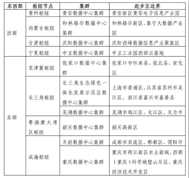 近日,國家發(fā)改委、中央網(wǎng)信辦、工信部、國家能源局四部門聯(lián)合發(fā)布復(fù)函,同意京津冀地區(qū)、長三角地區(qū)、粵港澳大灣區(qū)、成渝地區(qū)啟動建設(shè)全國一體化算力網(wǎng)絡(luò)國家樞紐節(jié)點。至此,八大樞紐節(jié)點均已完成批復(fù),各個樞紐節(jié)點集群起步區(qū)邊界明確(見下表)。起步區(qū)獲批建設(shè),是落實“東數(shù)西算”戰(zhàn)略的重要起步。