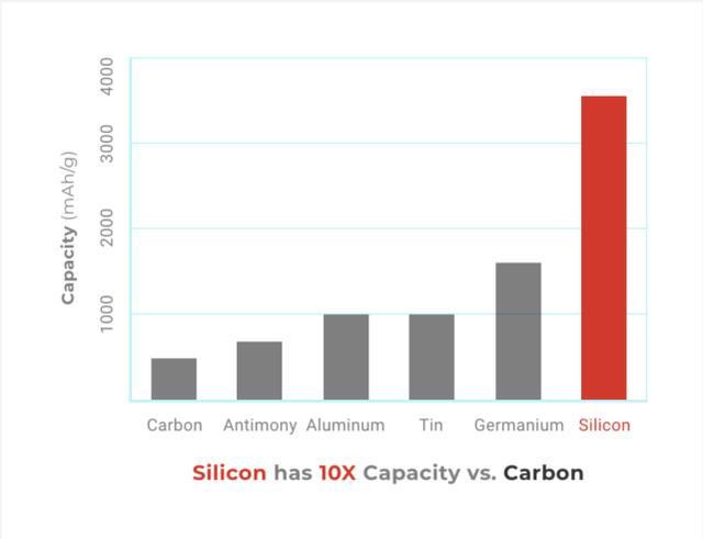 由于硅是能量密度最好的材料,因而使用100%硅材料意味著可以實現(xiàn)最高能量密度的鋰離子電池。