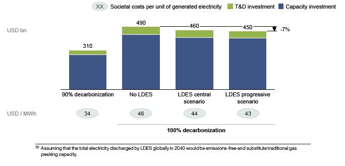最重要的是,這樣做而無(wú)需額外的社會(huì)成本。到2040年,僅在美國(guó)(如圖34所示),在100%的脫碳情景下,電力系統(tǒng)的總體成本每年可減少約350億美元,其中50億美元將來(lái)自于輸電和輸配電中的長(zhǎng)時(shí)儲(chǔ)能應(yīng)用擴(kuò)建項(xiàng)目。