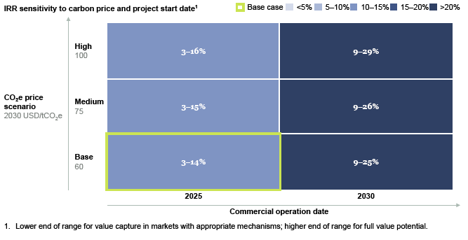 本案例的經(jīng)濟(jì)性對(duì)碳減排價(jià)格和項(xiàng)目開(kāi)始的日期很敏感。當(dāng)商業(yè)運(yùn)營(yíng)日期移至2030年時(shí),內(nèi)部收益率(IRR)將顯著增加至9%至25%,而長(zhǎng)時(shí)儲(chǔ)能系統(tǒng)的建設(shè)將在前兩年進(jìn)行。此外,加速碳減排價(jià)格上漲可能導(dǎo)致內(nèi)部收益率高達(dá)16%和29%,其運(yùn)營(yíng)日期分別為2025年和2030年(如圖33所示)。
