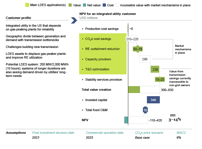 長(zhǎng)時(shí)儲(chǔ)能創(chuàng)造的價(jià)值可以使客戶廣泛受益。以下幾個(gè)客戶業(yè)務(wù)案例說(shuō)明了一些應(yīng)用程序在不久的將來(lái)創(chuàng)造價(jià)值的潛力。而在未來(lái)面臨輸電瓶頸的公用事業(yè)公司將從采購(gòu)和部署長(zhǎng)時(shí)儲(chǔ)能中受益,但在貨幣化方面面臨不確定性。