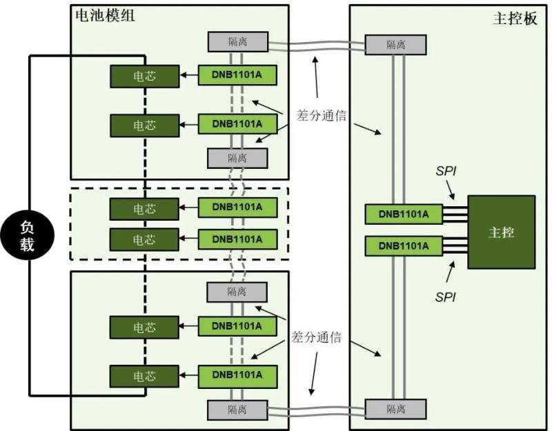 DNB1101A為每個單獨的電芯或并聯(lián)的一組電芯提供多種傳感功能,包括電壓監(jiān)測、溫度監(jiān)測和電化學阻抗譜(EIS)監(jiān)測。通過差分菊花鏈,電池參數信息被傳輸到電池組控制器。鏈中的第一顆芯片將標準SPI信號轉換為菊花鏈差分信號,反之亦然。芯片支持環(huán)形通信架構。
