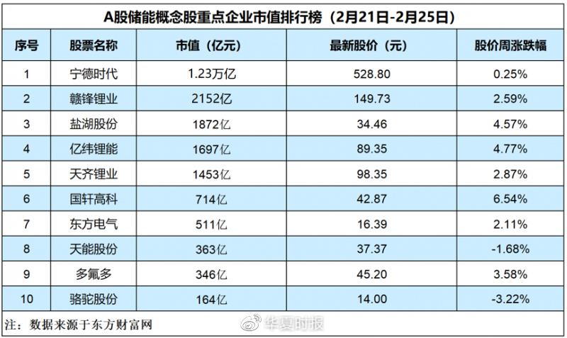 中國儲能網(wǎng)訊:本周(2月21日-2月25日)東方財富儲能概念板塊整體上漲2.57%?!度A夏時報》記者重點監(jiān)測的10家儲能企業(yè),除駱駝股份、天能股份兩家下跌外,其余全部收漲。