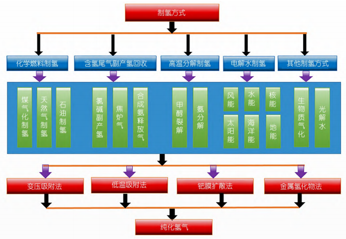 目前有多種制氫的方法, 大體可以分為化學(xué)原料制氫、含氫尾氣副產(chǎn)氫回收、高溫分解制氫、電解水制氫、其他方法制氫等5大類, 并經(jīng)過(guò)變壓吸附、低溫吸附、鈀膜擴(kuò)散法、金屬氫化物等方法分離提純獲得所需要純度的氫氣, 如圖1所示。