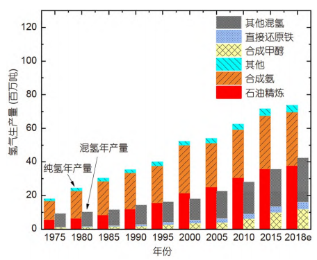 圖2顯示了世界純氫和混氫生產(chǎn)的年度變化純氫是經(jīng)過(guò)了分離和純化的氫氣, 混氫則含有一定量的伴生氣體, 且未經(jīng)分離和提純。純氫生產(chǎn)主要用于石油化工、氨合成、燃料電池等, 混氫主要用于甲醇合成、直接還原鐵生產(chǎn)以及其他領(lǐng)域。2018年, 全球純氫生產(chǎn)量為7400萬(wàn)噸, 混氫生產(chǎn)量為4200萬(wàn)噸, 合計(jì)11600萬(wàn)噸。