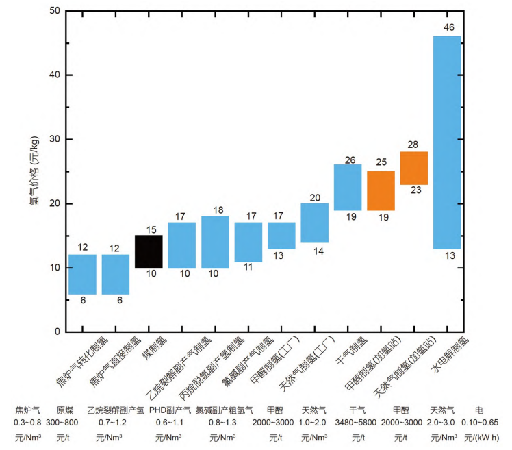 在氫能產(chǎn)業(yè)發(fā)展初期, 我國(guó)宜依托化工生產(chǎn)過(guò)程的氫氣或副產(chǎn)氫作為主供氫源, 以節(jié)省制氫投資, 降低成本, 助力氫能產(chǎn)業(yè)起步。圖3是不同制氫方法的氫氣價(jià)格與主要原材料價(jià)格關(guān)系。電解水制氫的氫氣價(jià)格隨著電價(jià)從13元/kg增長(zhǎng)到46元/kg, 增幅約2.5倍, 采用廉價(jià)的電力制氫成本與煤炭和天然氣制氫成本相當(dāng), 具有相當(dāng)?shù)母?jìng)爭(zhēng)優(yōu)勢(shì)。