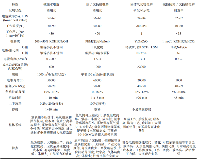 根據(jù)使用電解質(zhì)的不同, 電解水的方式可分為堿性水電解(alkaline, ALK)、質(zhì)子交換膜電解(proton exchange membrane, PEM)、固體氧化物電解(solid oxide electrolysis cell, SOEC)、堿性陰離子交換膜電解 (alkaline anion exchange membrane, AEM)等4種, 基本性能參數(shù)對(duì)比見(jiàn)表1。AEM目前處于初步探索階段; 關(guān)于SOEC, 由于環(huán)境的特殊性和公用工程條件的 局限性, 高溫水蒸氣電解制氫產(chǎn)業(yè)難以實(shí)施; 相對(duì)來(lái)說(shuō), 堿性電解槽制氫和質(zhì)子交換膜電解制氫較方便實(shí)施。