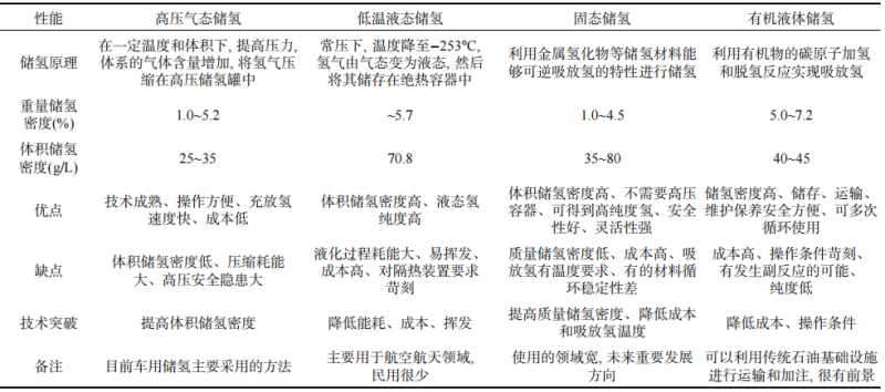 將來(lái)的制氫方向是電解水制氫, 而氫氣的儲(chǔ)運(yùn)沒(méi)有一個(gè)最好的方法, 只能選擇與應(yīng)用相應(yīng)的最佳方法。氫氣的儲(chǔ)存主要有高壓氣態(tài)儲(chǔ)氫、低溫液態(tài)儲(chǔ)氫、固儲(chǔ)氫和有機(jī)液體儲(chǔ)氫四大類, 各自的特點(diǎn)如表2所示。高壓氣態(tài)儲(chǔ)氫、低溫液態(tài)儲(chǔ)氫和有機(jī)液體儲(chǔ)氫具有容量高的優(yōu)勢(shì), 適合大型氫氣儲(chǔ)運(yùn), 但是分別對(duì)應(yīng)著安全隱患大、能源效率低和純度低等問(wèn)題; 固態(tài)儲(chǔ)氫的重量?jī)?chǔ)氫密度低, 但是體積儲(chǔ)氫密度高、安全性好、純度高。根據(jù)應(yīng)用場(chǎng)合的需要, 選擇適當(dāng)?shù)臍錃鈨?chǔ)運(yùn)方式。