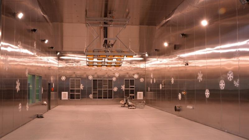 坐落在同一個工業(yè)園的熱環(huán)境實驗艙總?cè)莘e為880立方米(20x8x5.5m 長x寬x高),為國內(nèi)最大的單體熱管理系統(tǒng)測試設(shè)施,可以裝載整個40英尺的集裝箱儲能機組,準(zhǔn)確控制-40至+60℃的內(nèi)部環(huán)境溫度,模擬嚴(yán)苛的戶外環(huán)境條件,測試電池環(huán)境的控制效果,電池組在高溫時的安全,在寒冬時的衰減和表現(xiàn)。