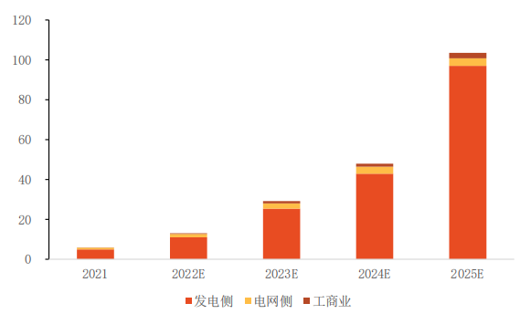 新增裝機量中,以政策推動的發(fā)電側(cè)占比最大。2022-2025年分別占總量的87.6%、89.0%、89.6%、93.7%。其次為發(fā)電側(cè)。
