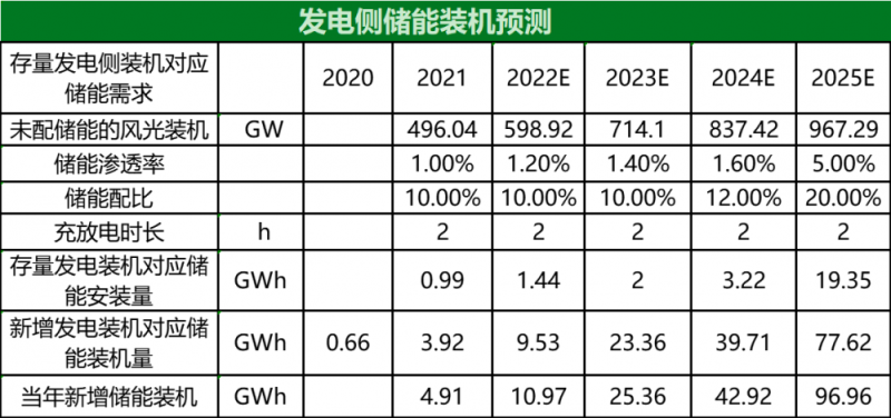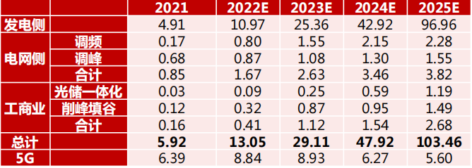 綜合來看,預(yù)計2022-2025年儲能新增裝機量(除5G應(yīng)用外)分別為13.05、29.11、47.92、103.46GWh。新增裝機量的21-25年年復(fù)合增長率約104.5%。
