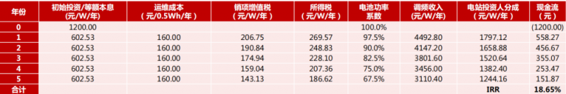 則當(dāng)儲能電站各項參數(shù)均處于行業(yè)領(lǐng)先的水平時,預(yù)計調(diào)頻之后所產(chǎn)生的內(nèi)部收益率約18.65%。