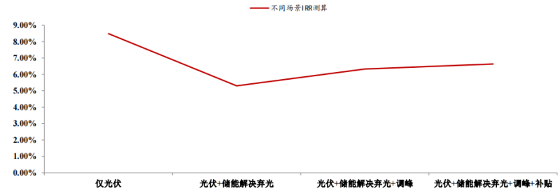 發(fā)電側(cè)配儲的商業(yè)模式主要為:1、光伏+儲能解決棄光;2、光伏+儲能解決棄光+參與市場化調(diào)峰輔助服務(wù)。僅光伏發(fā)電不用儲能,通過測算,內(nèi)部收益率為為8.48%。如果如果儲能加入光伏發(fā)電來解決棄光,且僅僅為解決棄光,民生證券的預(yù)測顯示,那么內(nèi)部收益率會下降至5.30%。