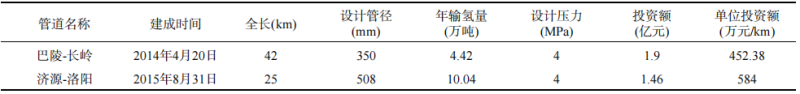 我國(guó)氫氣管網(wǎng)發(fā)展不足, 輸氫管道主要分布在環(huán)渤海灣、長(zhǎng)江三角洲等地, 目前已知最長(zhǎng)的輸氫管道為巴陵-長(zhǎng)嶺輸氫管道, 全長(zhǎng)約42 km、壓力為4 MPa, 其次是濟(jì)源-洛陽輸氫管道(25 km), 兩者的技術(shù)參數(shù)如表3所示。目前全國(guó)累計(jì)僅有100 km輸氫管道, 氫氣管網(wǎng)布局有較大的提升空間。