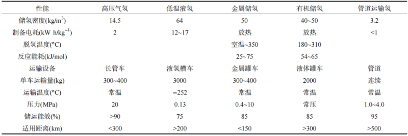 表 1 幾種常用氫氣輸運(yùn)方法的性能比較