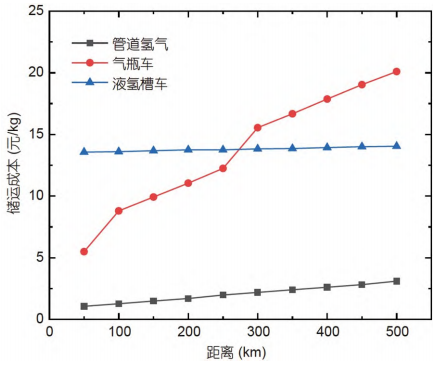 圖 1 3種主要輸氫方式價(jià)格與距離的變化