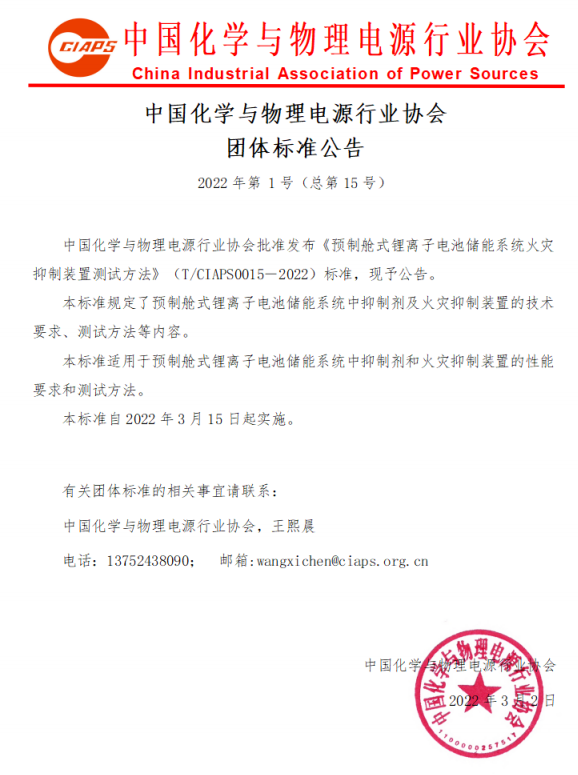 中國化學(xué)與物理電源行業(yè)協(xié)會(huì)批準(zhǔn)發(fā)布《預(yù)制艙式鋰離子電池儲(chǔ)能系統(tǒng)火災(zāi)抑制裝置測試方法》(T/CIAPS0015―2022)標(biāo)準(zhǔn),現(xiàn)予公告。