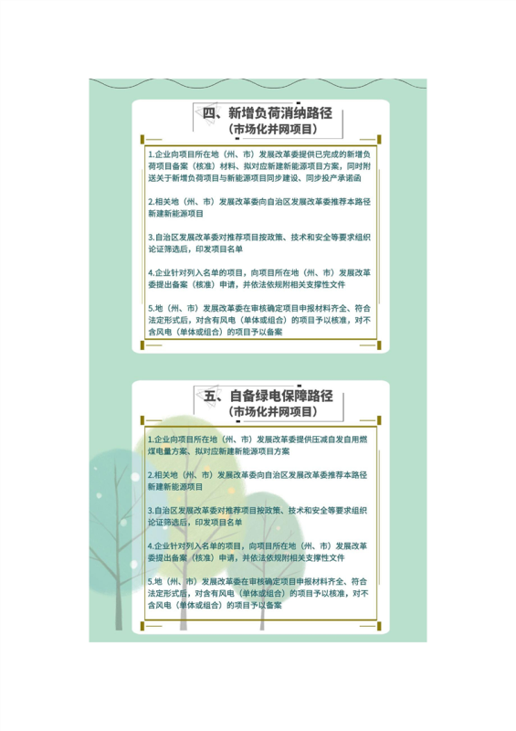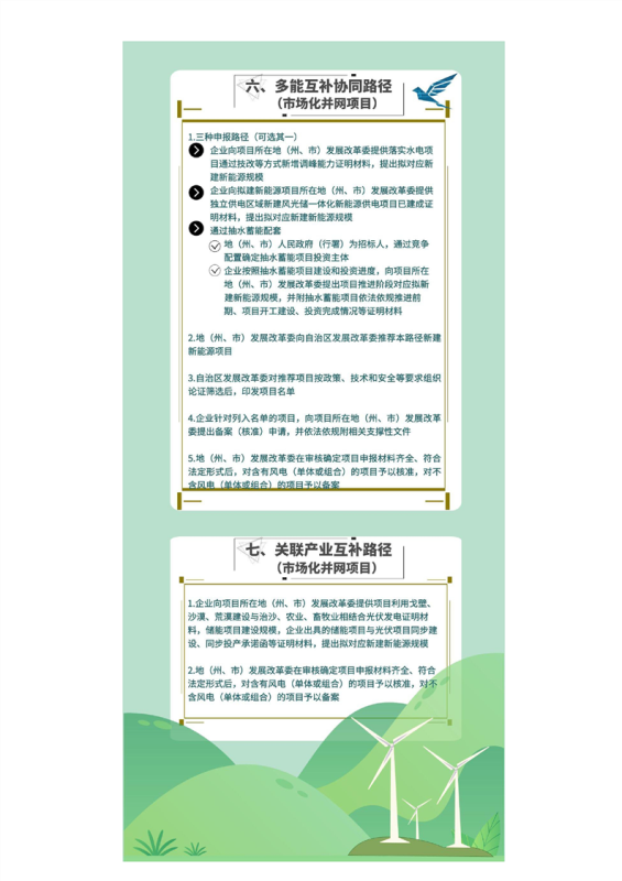 二是第(一)條路徑中項目為保障性并網(wǎng)項目,光伏(向大電網(wǎng)送電)項目由自治區(qū)發(fā)展改革委備案,風電項目由地(州、市)發(fā)展改革委核準;第(二)(三)(四)(五)(六)條路徑中項目,為通過源網(wǎng)荷儲一體化、多能互補等方式建設(shè)的市場化并網(wǎng)項目。根據(jù)《國家發(fā)展改革委 國家能源局關(guān)于完善能源綠色低碳轉(zhuǎn)型體制機制和政策措施的意見》(發(fā)改能源〔2022〕206號)中“深化能源領(lǐng)域‘放管服’改革,優(yōu)化清潔低碳能源項目核準和備案流程”精神,自治區(qū)發(fā)展改革委經(jīng)組織國家能源局新疆監(jiān)管辦、自治區(qū)自然資源廳、生態(tài)環(huán)保廳、國網(wǎng)新疆電力有限公司等相關(guān)部門和單位,按政策、技術(shù)和安全等要求論證,將符合要求的項目列入自治區(qū)項目名單后,統(tǒng)一由地(州、市)發(fā)展改革委核準(備案);第(七)條路徑中項目為市場化并網(wǎng)項目,由各地(州、市)發(fā)展改革委核準(備案)。