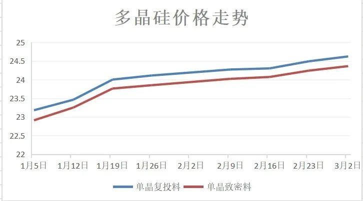與年初相比,國內(nèi)多晶硅的最新成交均價上漲均超過1萬元/噸——單晶復(fù)投料成交均價較年初增加1.44萬元/噸,漲幅6.21%;單晶致密料成交均價較年初增加1.46萬元/噸,漲幅6.37%。