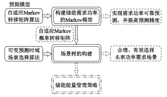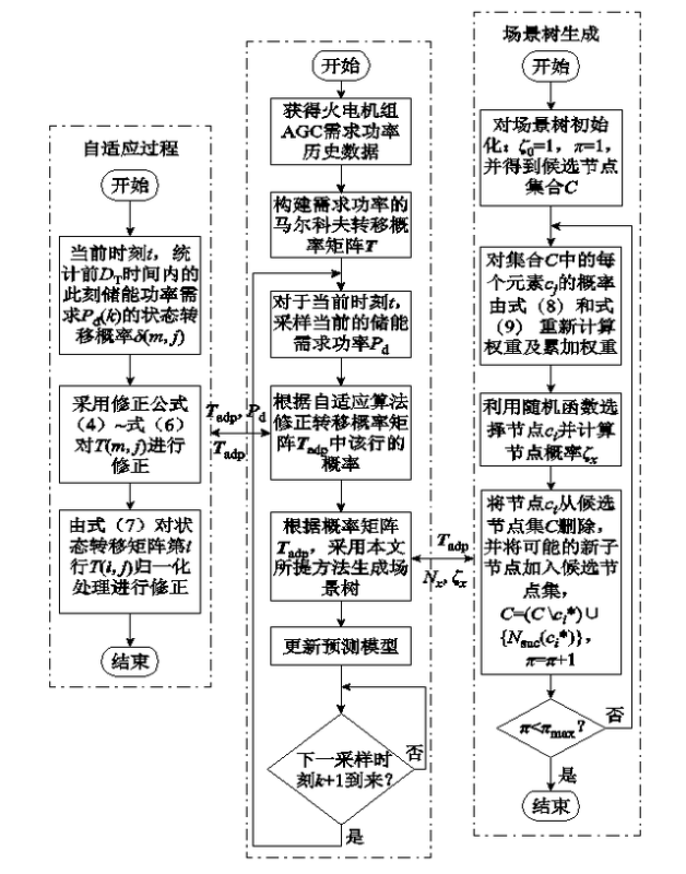 他們首先針對火電機組響應(yīng)AGC指令時功率隨機變化且難以實時監(jiān)測的問題,采用馬爾科夫鏈建立儲能需求功率模型,并針對AGC指令周期性波動的特點,采用后驗信息實時自適應(yīng)調(diào)整Markov轉(zhuǎn)移概率矩陣以提高預(yù)測精度。然后,針對隨機場景繁多的問題,提出一種可變預(yù)測時域的場景樹生成方法。該方法能夠在樹節(jié)點規(guī)模一定的前提下更有效地選擇預(yù)測場景。最后,通過算例分析了所提自適應(yīng)預(yù)測模型的準(zhǔn)確性。結(jié)果表明,所提模型能夠為優(yōu)化能量管理策略提供更有效、可靠的功率預(yù)測信息。