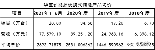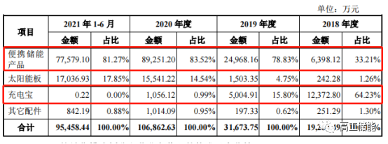 從產(chǎn)品結(jié)構(gòu)看,2018年開始,華寶新能源業(yè)績?cè)鲩L引擎從充電寶逐漸向便攜儲(chǔ)能產(chǎn)品轉(zhuǎn)移。2018年到2021年1-6月,華寶新能源來自充電寶的收入從1.24億元驟減到2200萬元,而便攜儲(chǔ)能產(chǎn)品收入則從6398.12萬元猛增至7.76億元。
