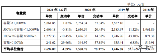 從產(chǎn)品價(jià)格來看,根據(jù)華寶新能源便攜式儲(chǔ)能產(chǎn)品近幾年的銷量及營收數(shù)據(jù)粗略測(cè)算,2021年上半年,其終端產(chǎn)品平均單價(jià)達(dá)到2693.72元;1KWh產(chǎn)品售價(jià)超過2000元/臺(tái)。反觀2021年上半年,三元電池系統(tǒng)售價(jià)1KWh已經(jīng)不到1000元。