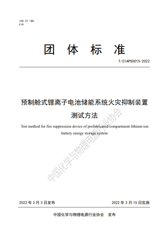 中國(guó)化學(xué)與物理電源行業(yè)協(xié)會(huì)批準(zhǔn)發(fā)布《預(yù)制艙式鋰離子電池儲(chǔ)能系統(tǒng)火災(zāi)抑制裝置測(cè)試方法》(T/CIAPS0015―2022)標(biāo)準(zhǔn),現(xiàn)予公告。