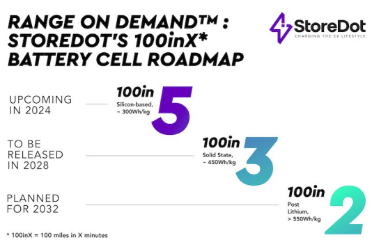 近日,以色列電池生產商StoreDot近日對外展示了其技術路線圖"100inX"。該公司計劃在未來10年內,開發(fā)出充電兩分鐘續(xù)航100英里(160公里)的電池。預計到2024年,StoreDot目前正在開發(fā)中的(未來或與EVE合作批量生產的)電池,可以實現(xiàn)充電五分鐘續(xù)航100英里(160公里)。