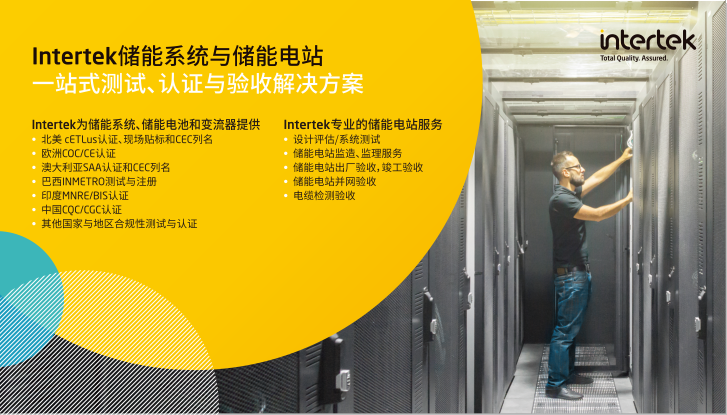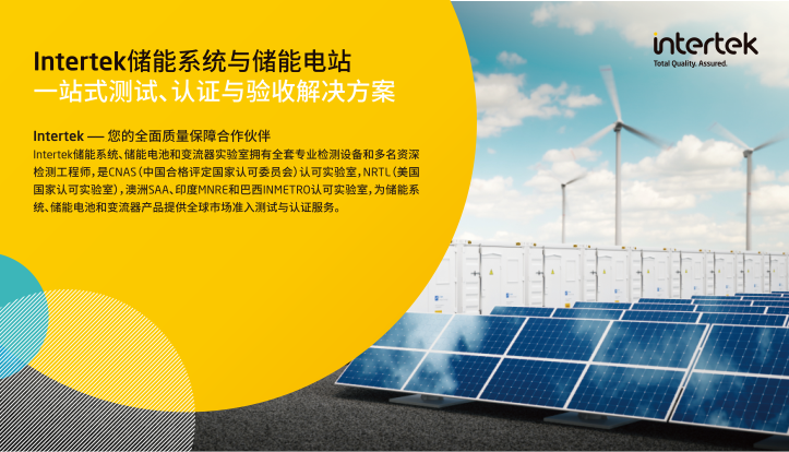 Intertek憑借遍布全球的技術(shù)網(wǎng)絡(luò)以及本地化的儲(chǔ)能系統(tǒng)實(shí)驗(yàn)室,為國(guó)內(nèi)外儲(chǔ)能產(chǎn)品生產(chǎn)企業(yè)提供全球一站式的專業(yè)服務(wù),服務(wù)內(nèi)容涵蓋北美 cETLus認(rèn)證及現(xiàn)場(chǎng)貼標(biāo)和CEC列名、歐洲COC/CE認(rèn)證、澳大利亞SAA認(rèn)證和CEC列名、巴西INMETRO測(cè)試與注冊(cè)、印度MNRE/BIS認(rèn)證、中國(guó)CQC/CGC認(rèn)證等各個(gè)國(guó)家和地區(qū)的市場(chǎng)準(zhǔn)入服務(wù)。同時(shí),亦可為 儲(chǔ)能電站提供設(shè)計(jì)評(píng)估/系統(tǒng)測(cè)試、儲(chǔ)能電站監(jiān)造及監(jiān)理服務(wù)、儲(chǔ)能電站出廠驗(yàn)收及竣工驗(yàn)收、儲(chǔ)能電站并網(wǎng)驗(yàn)收和電纜檢測(cè)驗(yàn)收等服務(wù)。