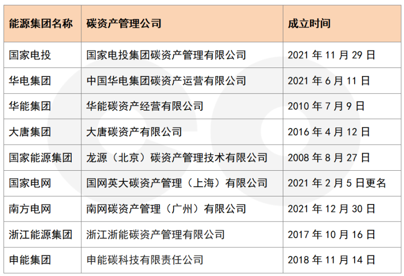 目前,國內(nèi)發(fā)電集團等重點控排主體或通過成立專業(yè)的碳資產(chǎn)管理公司,或組建專門的碳資產(chǎn)管理部門來實現(xiàn)碳市場的履約和資產(chǎn)管理。公開信息可見,五大發(fā)電集團、部分地方發(fā)電集團及電網(wǎng)均成立了專業(yè)的碳資產(chǎn)管理公司。