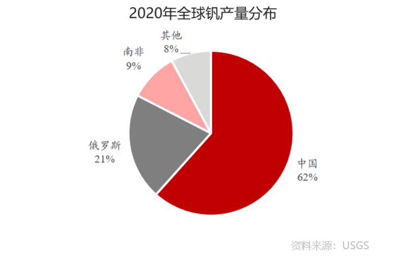 產(chǎn)量方面,中國釩礦產(chǎn)量仍然占全球最高。2020年全球共生產(chǎn)礦產(chǎn)釩8.6萬噸,中國生產(chǎn)礦產(chǎn)釩5.3萬噸,占全球釩礦產(chǎn)量62%,俄羅斯和南非分別生產(chǎn)釩1.8萬噸和0.8萬噸。
