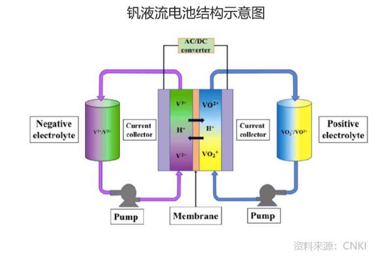 釩液流電池通過釩離子的氧化還原反應(yīng)實現(xiàn)充放電功能,其原理及特性使其具備安全性高、儲能上限高、功率可自由調(diào)節(jié)、使用壽命長、自放電率低、環(huán)境友好等一系列其他儲能方式所不具備的優(yōu)勢。