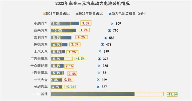 很明顯可以看到,比亞迪、特斯拉(國(guó)內(nèi)市場(chǎng))和上汽通用五菱幾乎退出了三元?jiǎng)恿﹄姵剀囆偷牟季?,新?shì)力理想、小鵬、蔚來和哪吒,吉利、上汽乘用等傳統(tǒng)車企,南北大眾、華晨寶馬等合資品牌,是目前三元新能源汽車的主力軍。