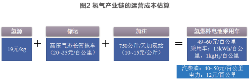 氫能儲(chǔ)運(yùn)及利用方面,儲(chǔ)運(yùn)技術(shù)尚未實(shí)現(xiàn)突破,成本偏高,最終導(dǎo)致氫氣在終端應(yīng)用上銷售價(jià)格偏高,如圖2所示,以0.3元/千瓦時(shí),5.5千瓦時(shí)/立方米氫氣條件下,電解水制氫時(shí),不考慮損耗,氫源價(jià)格約為19元/kg,到燃料電池終端的運(yùn)營成高達(dá)60元左右,高于汽柴油和電車的運(yùn)營成本。