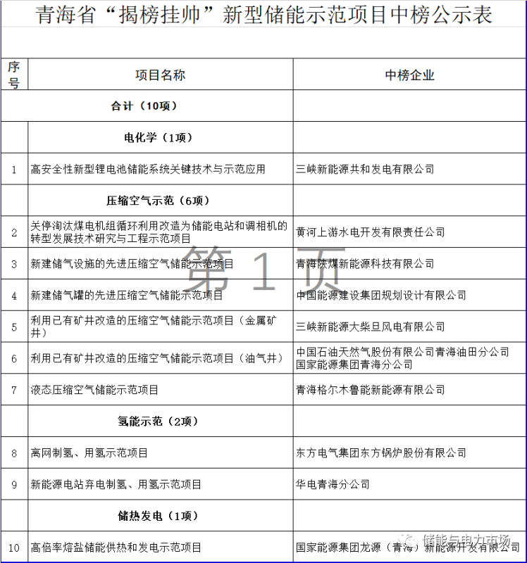 中國儲能網(wǎng)訊:3月21日,青海省發(fā)改委發(fā)布《關(guān)于青海省“揭榜掛帥”新型儲能 示范項目中榜公示》,共計10個儲能項目進入公示榜單,涉及鋰離子電池、壓縮空氣儲能、氫儲能、熔鹽儲熱等多項技術(shù)。