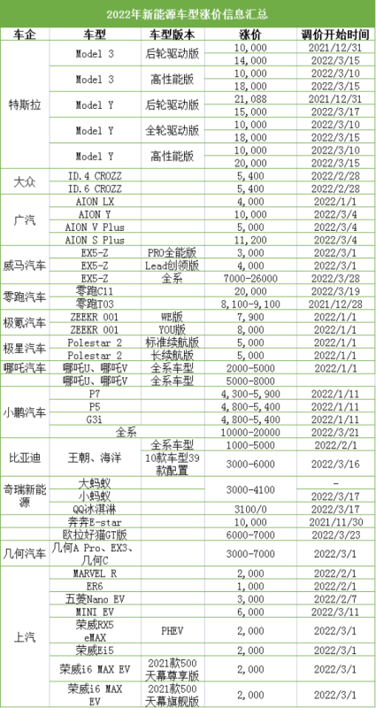 如特斯拉僅3月已經(jīng)連續(xù)3次提價(jià),分別在3月10日、15日、17日對(duì)旗下全系國產(chǎn)車型上調(diào)價(jià)格,累計(jì)漲幅達(dá)到1.4-3萬元;而這還不包括其去年底已經(jīng)宣布的1-2萬元漲價(jià)幅度。小鵬汽車亦啟動(dòng)2022第二次漲價(jià),3月21日旗下在售車型價(jià)格上調(diào)1.01-3.26萬元,漲幅看齊特斯拉。