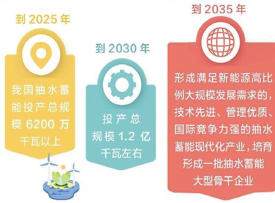 《規(guī)劃》要求加快抽水蓄能電站核準(zhǔn)建設(shè),各省(區(qū)、市)能源主管部門根據(jù)中長期規(guī)劃,結(jié)合本地區(qū)實(shí)際情況,統(tǒng)籌電力系統(tǒng)需求、新能源發(fā)展等,按照能核盡核、能開盡開的原則,在規(guī)劃重點(diǎn)實(shí)施項(xiàng)目庫內(nèi)核準(zhǔn)建設(shè)抽水蓄能電站。到2025年,抽水蓄能投產(chǎn)總規(guī)模較“十三五”翻一番,達(dá)到6200萬千瓦以上;到2030年,抽水蓄能投產(chǎn)總規(guī)模較“十四五”再翻一番,達(dá)到1.2億千瓦左右;到2035年,形成滿足新能源高比例大規(guī)模發(fā)展需求的,技術(shù)先進(jìn)、管理優(yōu)質(zhì)、國際競爭力強(qiáng)的抽水蓄能現(xiàn)代化產(chǎn)業(yè),培育形成一批抽水蓄能大型骨干企業(yè)。
