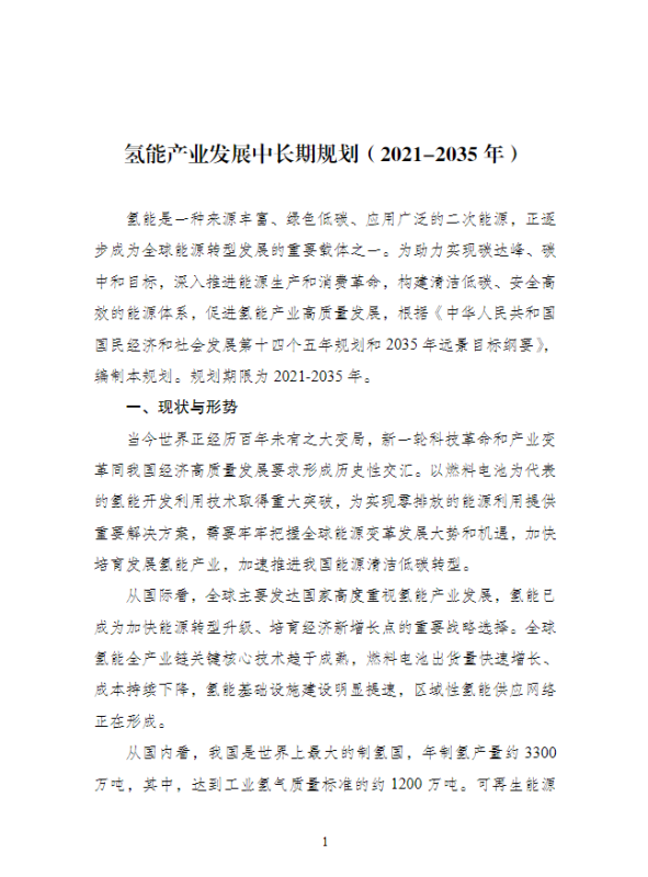 中國(guó)儲(chǔ)能網(wǎng)訊:3月23日,為促進(jìn)氫能產(chǎn)業(yè)規(guī)范有序高質(zhì)量發(fā)展,經(jīng)國(guó)務(wù)院同意,國(guó)家發(fā)展改革委、國(guó)家能源局聯(lián)合印發(fā)《氫能產(chǎn)業(yè)發(fā)展中長(zhǎng)期規(guī)劃(2021-2035年)》(以下簡(jiǎn)稱《規(guī)劃》)。