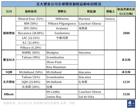 表6:五大鋰業(yè)公司全球鋰資源權(quán)益及布局情況