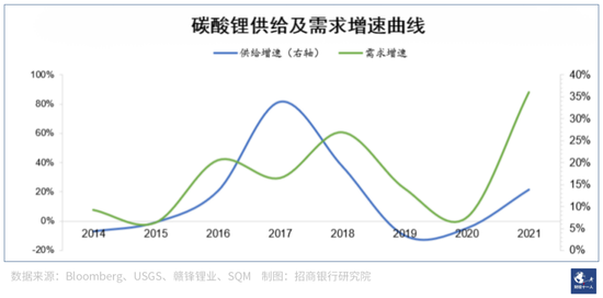 圖2:2014年-2021年碳酸鋰供給及需求增速曲線