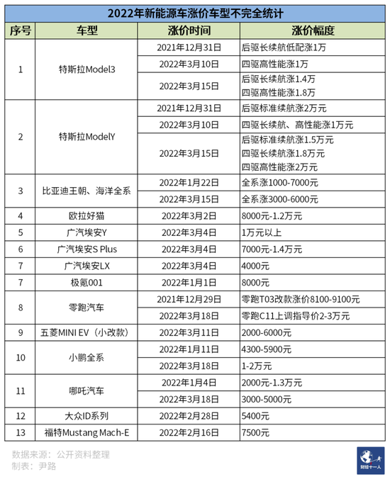 表1:2022年新能源車(chē)漲價(jià)車(chē)型不完全統(tǒng)計(jì)