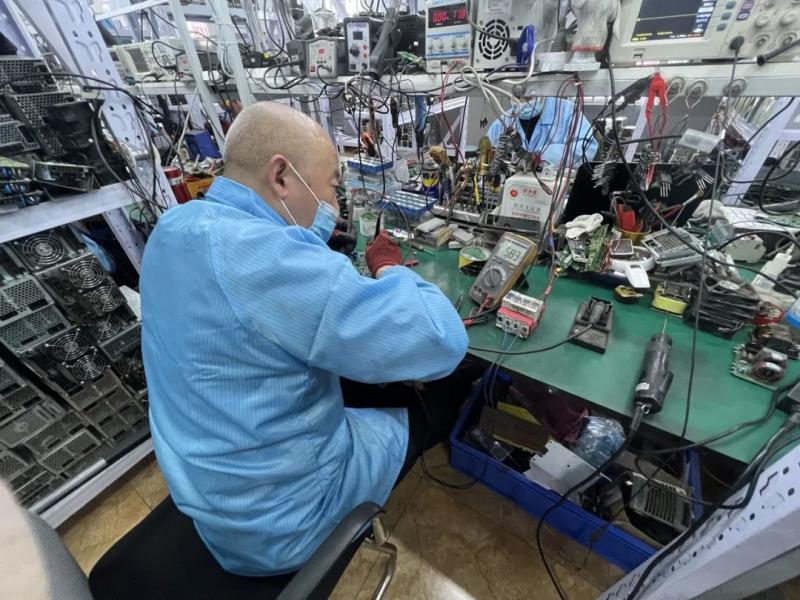 電源開關(guān)回收線上,維修工程師彭海波正在修理電源模塊的控制板?!皯?yīng)該是控制電流的元器件短路了,修理好估計(jì)需要一天時(shí)間?!?