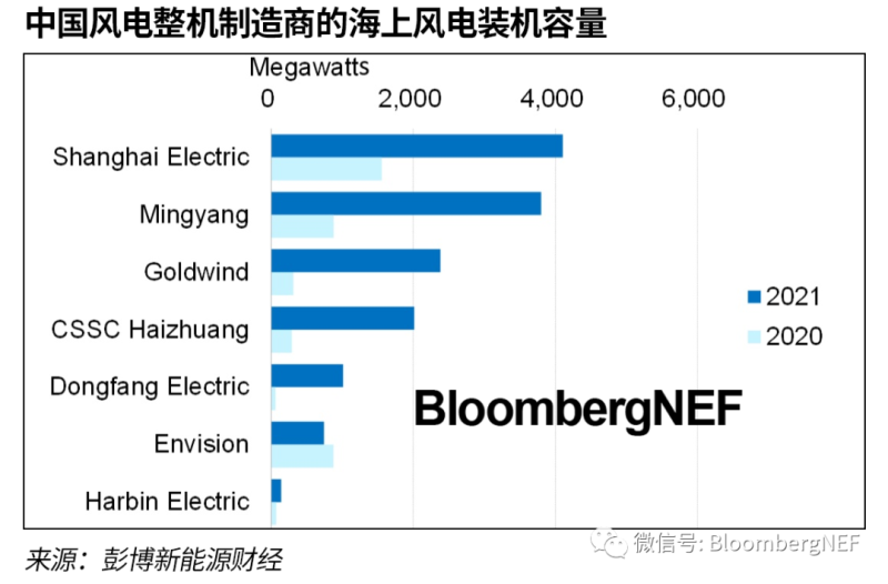 中國(guó)儲(chǔ)能網(wǎng)訊:中國(guó)2021年新增的海上風(fēng)電裝機(jī)容量達(dá)到創(chuàng)紀(jì)錄的14.2GW,是2020年的三倍有余。數(shù)家中國(guó)制造商為整個(gè)市場(chǎng)供應(yīng)風(fēng)電整機(jī),因而在彭博新能源財(cái)經(jīng)2021年全球海上風(fēng)電整機(jī)制造商排名中名列前茅。這是中國(guó)企業(yè)首次在該排行榜上位居榜首。