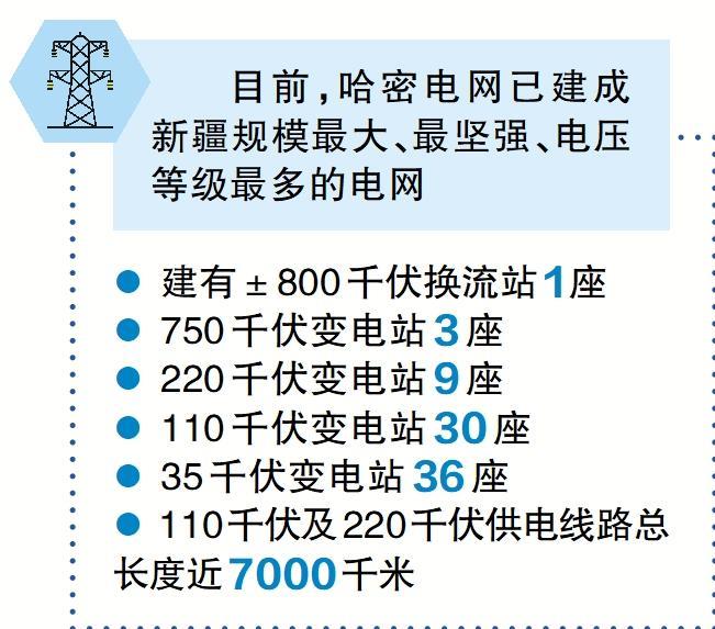 目前,哈密電網(wǎng)已建成新疆規(guī)模最大、最堅(jiān)強(qiáng)、電壓等級(jí)最多的電網(wǎng),建有±800千伏換流站1座、750千伏變電站3座、20千伏變電站9座、110千伏變電站30座、35千伏變電站36座,110千伏及220千伏供電線路總長(zhǎng)度近7000千米?!笆奈濉逼陂g,哈密將推動(dòng)“疆電外送”直流第三通道哈密到重慶±800千伏特高壓直流輸電工程建設(shè),工程建成后預(yù)計(jì)每年增加外送電量400億千瓦時(shí)以上。