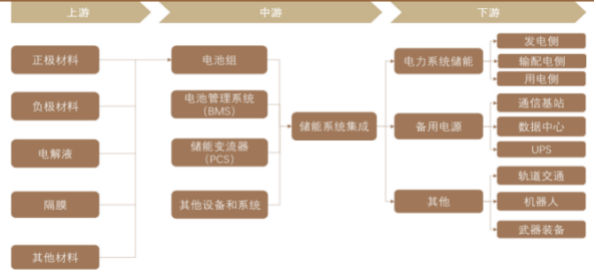 上游電池原材料主要包括正負(fù)極材料、電解液、隔膜等。中游的核心部件主要包括電池組、儲(chǔ)能變流器(PCS)、電池管理系統(tǒng)(BMS)、能量管理系統(tǒng)(EMS)等。下游的應(yīng)用場(chǎng)景主要包括電力系統(tǒng)儲(chǔ)能、備用電源等。