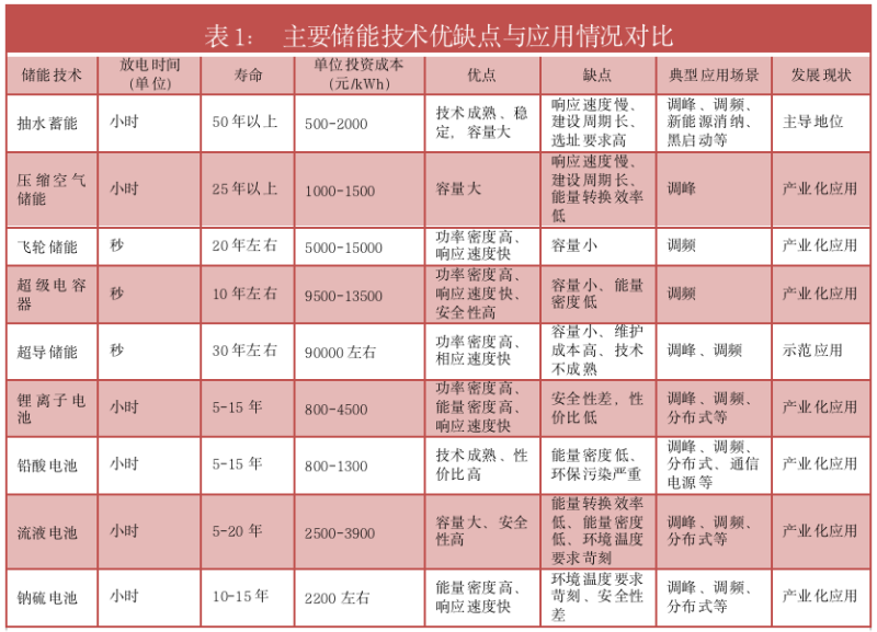 下面對(duì)主要儲(chǔ)能方式的技術(shù)特點(diǎn)和應(yīng)用情況進(jìn)行比較。鋰離子電池的綜合表現(xiàn)優(yōu)于其他競(jìng)爭(zhēng)對(duì)手,這是該技術(shù)成為新增儲(chǔ)能裝機(jī)主力的原因。